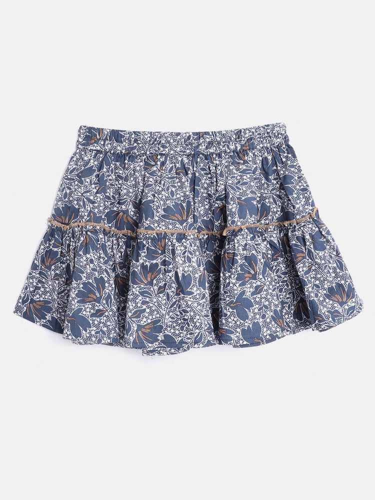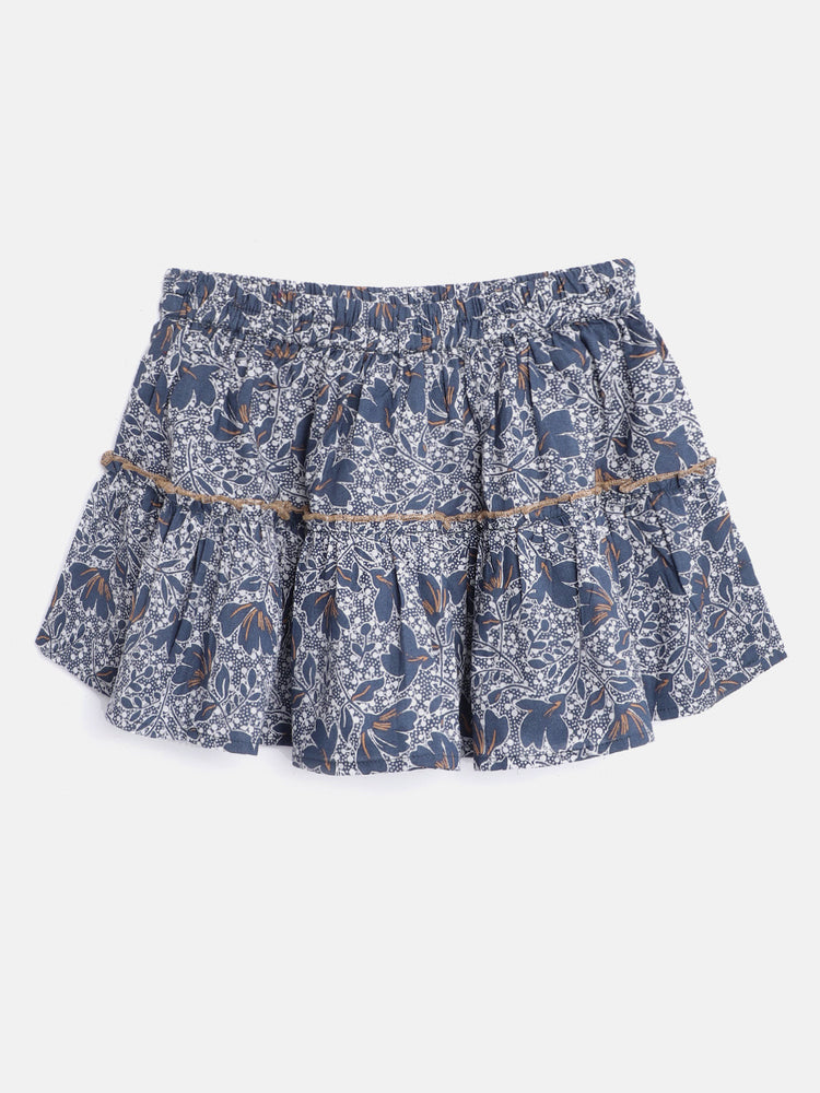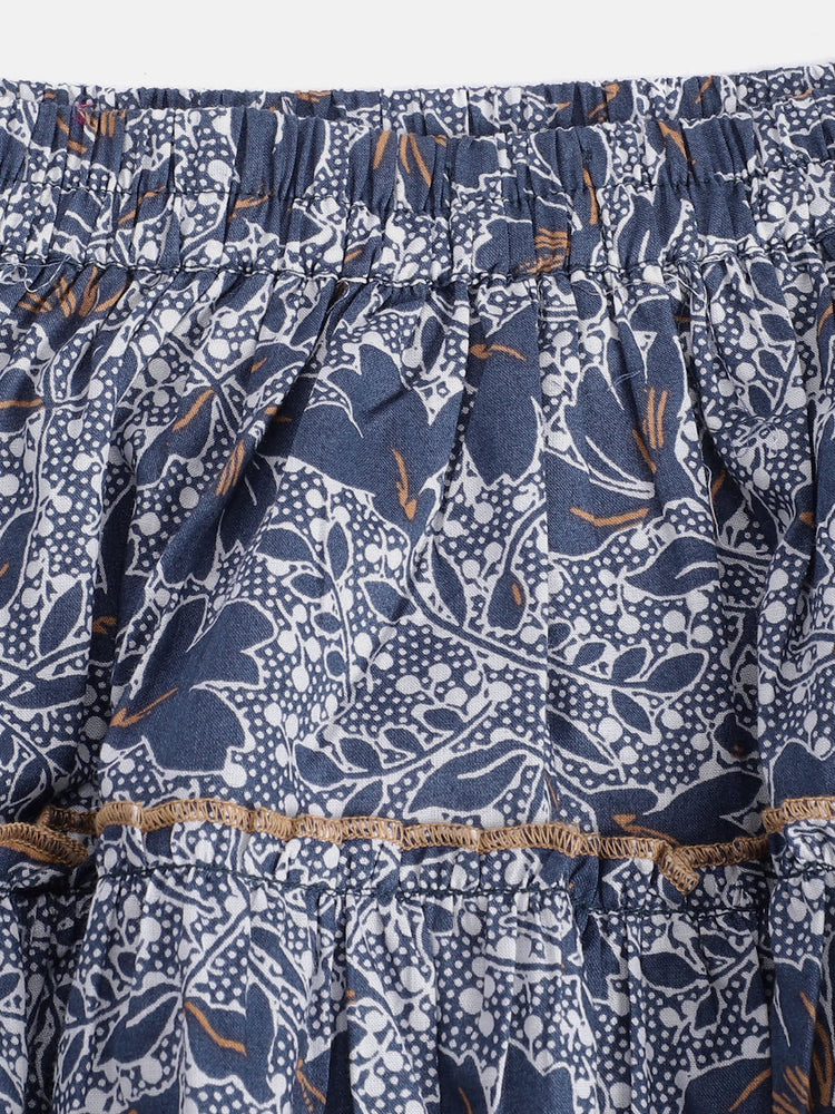 Blue with a tinge of grey and white ethnic motifs print tiered flared skirt, has an elasticated waistband and a slip-on closure.